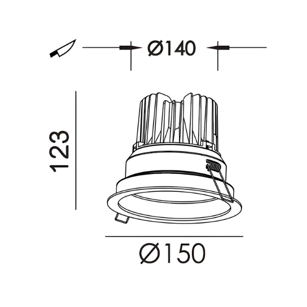 Diameter: 150mm; Height: 123mm; Cut Out: 140mm